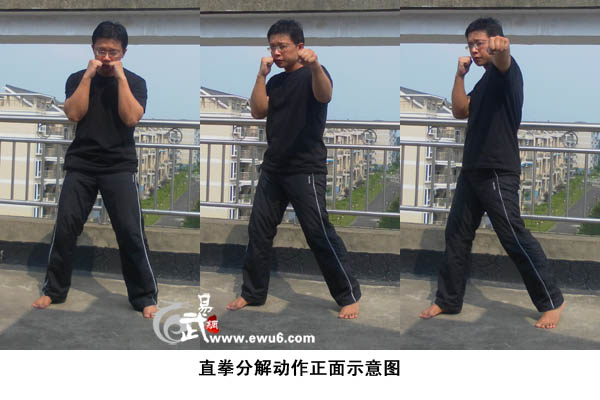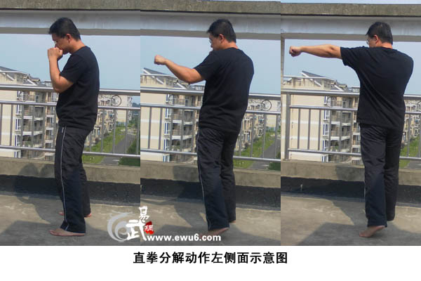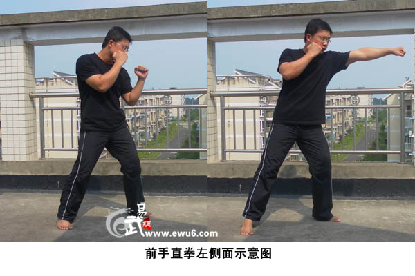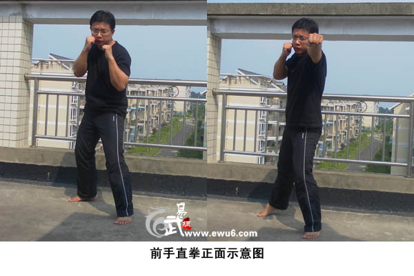 前手直拳比较简单,就是以上述的发力原理,抖腰将前手打出,上身略微前倾,前肩充分探出展开,击打瞬间握拳发力,击打后快速放松回收。探肩有两个目的,一是发力更充分,二是能让肩部自然抬起保护下巴。(如图)