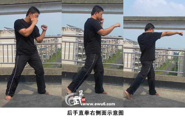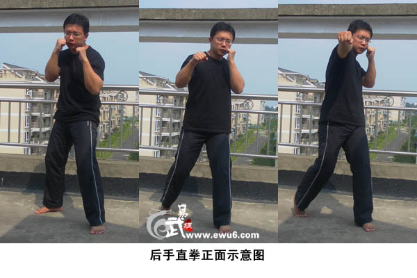 所有的后手拳都有一点要注意,这是练拳中最容易出现的错误:出后手拳时后腿要向内转动合胯,这也是格斗式两脚连线要与正前方面成45度角的原因之一,如果两脚在一条直线上,后腿向内转动里就会被前腿挡住,造成合胯不到位,而合胯不到位的后果就是你出后手拳时上身转动不到位,只能上身前倾去出拳,没有力量,也不好控制重心。(包括后面的所有拳法肘法)