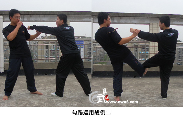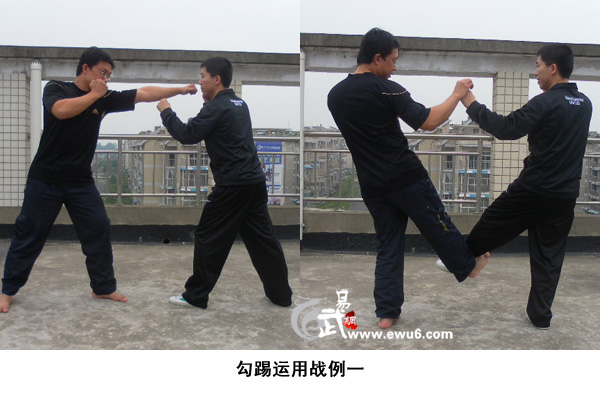 对手向前出拳时(不管前后手)重心必然落在前腿上,这时只要踢中对手前腿就能完全破坏对手的重心。勾踢力量足的话完全可以一脚踢倒对手。