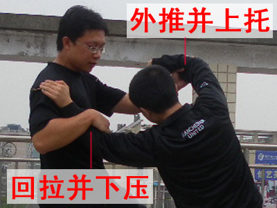 对手左脚在前,双手抓我衣服推搡,我双手分别找对手的双肘,左手由下往上托,右手由上往下压,使对手上身向右扭转,同时以勾踢攻击对手前腿,将对手摔倒。