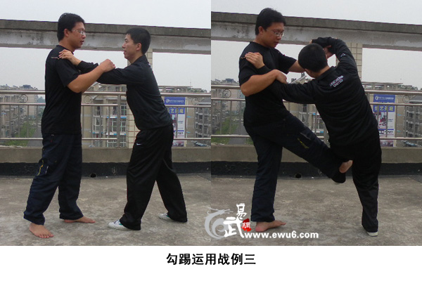 在实战中,勾踢可以和低边腿配合使用,以低边腿踢中对手后,顺踢击发力的方向勾起脚尖勾带对手下肢,可以取得不错的效果。