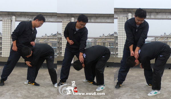 对手抱住我前腿,头在我两腿中间,我后脚快速后撤一步,以前手用力捏住对手后脑下按,控制住对手头部,让对手不能向上发力将我抱起,同时后手以直拳向下连续攻击对手头部,到对手松手为止。