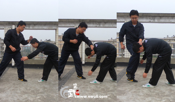 对手低头前冲时,稍微侧向闪身,前手向下按对手的后脑位置(或者肩部、上背部也行),给对手的上身加一个向下的力量,使对手的前冲变成向下扑,对手就只能双手扶地保持平衡,防止自己扑倒,无法再前冲抱腿,我方可以趁此机会以顶膝攻击对手头部。
