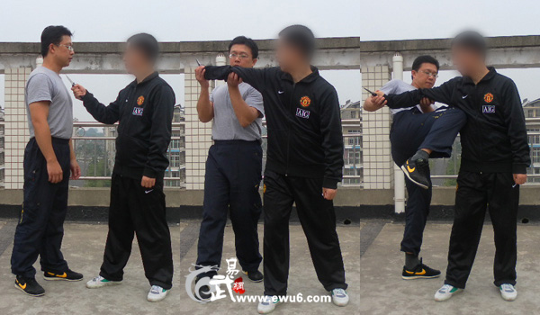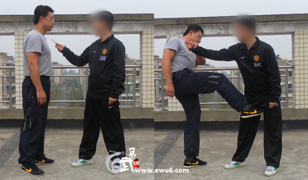 对手正面持刀顶住我的咽喉进行威胁,我头部稍后仰脱离刀尖的接触,左手从对手持刀手外侧向内拍挡并顺势抓住对手手腕内压,同时下方起脚以正弹踢攻击对手裆部。