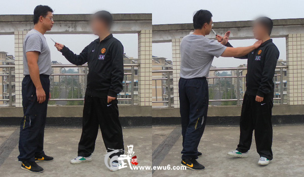 对手正面持刀顶住我咽喉进行威胁,我头部稍后仰脱离刀尖接触,左手从对手持刀内侧向外格挡并顺势下压抓住对手持刀手腕,同时另一只手以平拳攻击对手咽喉。