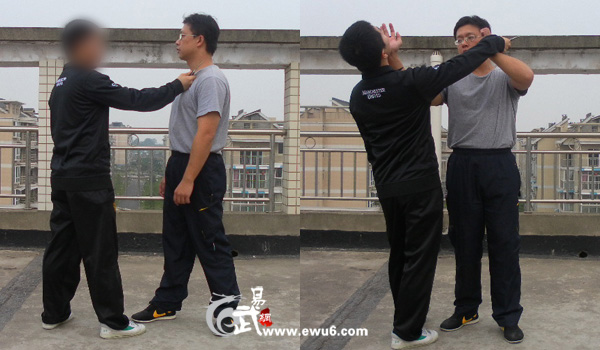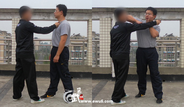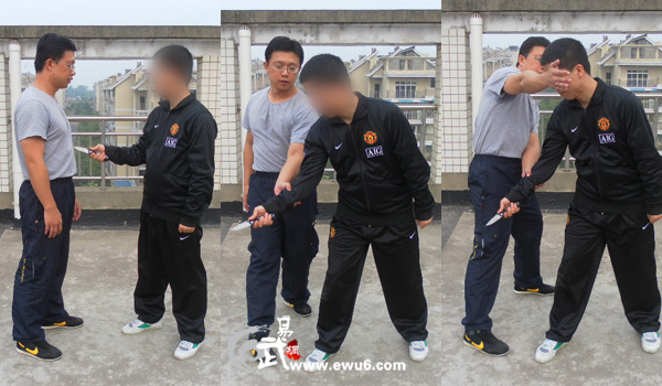 战例三: 对手持刀顶在我腹部进行威胁,我略收腹脱离与对手刀尖的接触,左手从对手手臂外侧拍挡对手持刀手臂并顺势抓拿,同时向对手手臂外侧斜上步,到达对手侧面,右手以摆拳或底掌迎击打击对手面部。
