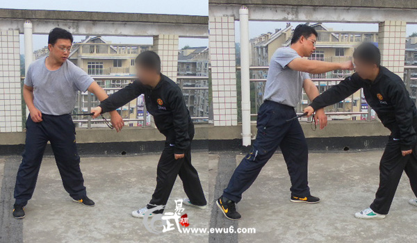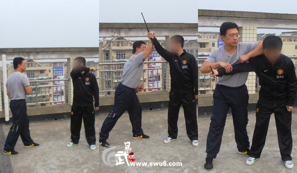 战例一: 对手执棍(砍刀)向我头部反向扫击,我快速前冲,后手向前格挡对手持械手并顺势抓拿,前手以摆肘攻击对手头部。