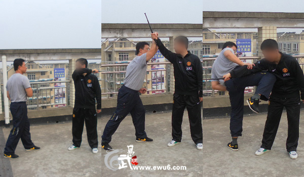 战例二: 对手执棍(砍刀)向我头部反向扫击,我快速前冲,后手向前格挡对手持械手并顺势抓拿,然后借对手前冲的力量以后腿迎击对手胸腹部。