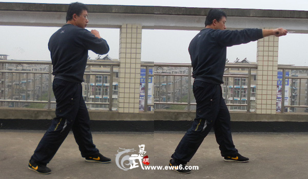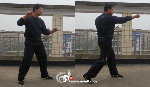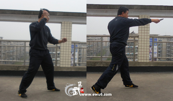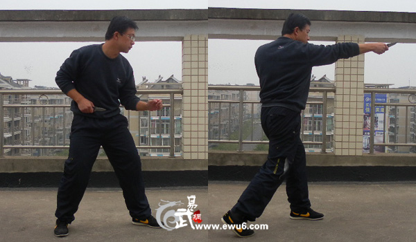 正划是类似劈砍的动作,但短刀不可能有砍刀的攻击力,所以只是路线相似,划是用刀尖割划对手而不是用刃砍对手,如果攻击时对手前移,可以手腕下压顺势用刀刃割对手。图中示范的是完整动作,在实战中如果对手距离很近可以完全利用手腕的动作运刀割划对手。
