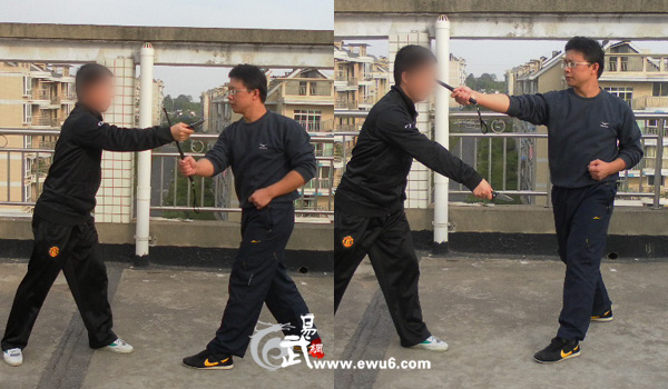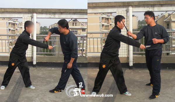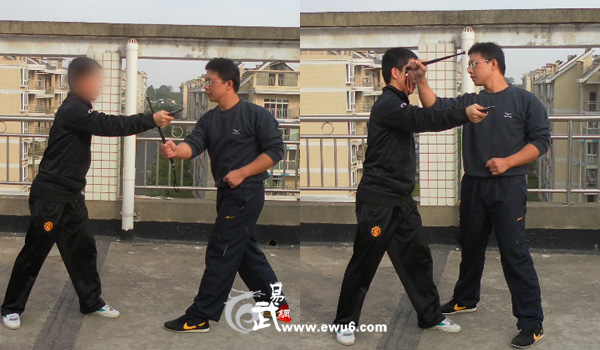 对手持刀向我腹直刺,我稍后撤同时以短棍向下劈打对手持械手,然后借力向上反扫对手头部。