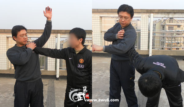 动作要点:此动作杀伤力控制比较灵活,如果需要杀伤对手,可以直接并指向前戳击对手咽喉,不需杀伤时可以先快速出用抵住对手胸前,避免被对手拖动,然后手稍向上移动按压对手咽喉。