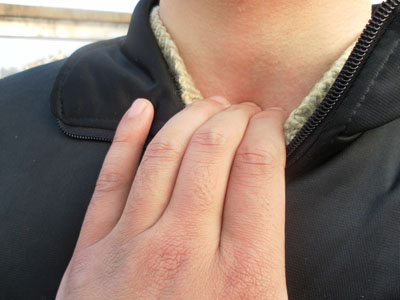 对手右手抓扯我胸前衣服,我直接向前伸右手用指尖顶住对手咽喉向前按压,迫使对方松手,也可以左手固定对手抓衣服的手,右手按压对手咽喉同时身体向左拧转,用身体力量反拧对手手臂,配合按压咽喉动作将对手摔倒。