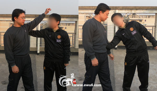 对手从侧后方抓我肩部衣服,我靠近对手一侧手臂举起,然后身体向后拧转,手臂同时快速下压,迫使对方放手。