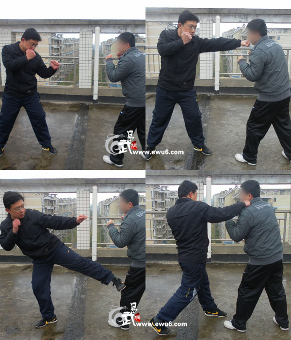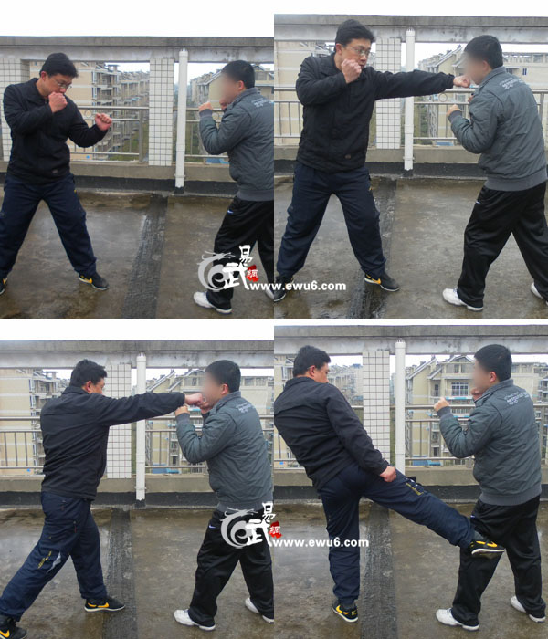 组合三:前手直拳+前腿低侧踹+后手直拳 敌我对峙,我向前以前手直拳攻击对手面部,配合出拳前冲的力量下方以低侧踹攻击对手大腿正面或者小腹部,快速收腿落地接上后手直拳攻击对手头部。 这个组合和前面战例二在技术动作上就是低边腿变成了低侧踹,但实战中的要点是完全不一样的。前低边腿力量不大,主要是作为战术动作吸引对手注意力。而本组合中的低侧踹却是实实在在的攻击。在前手直拳的掩护下出击,同时又借助出前手直拳时身体前冲的力量,不管踹对手的大腿正面还是小腹都要踹出力量。踹完后要快速收腿,化解踹人的反作用力,同时保证快速落地接上后手直拳。