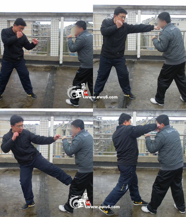 敌我对峙,我快速向前移动并以前手直拳攻击对手面部,收拳时上身稍后仰以前腿边腿攻击对手前腿大腿内侧,完成攻击后顺势向前落步以后手摆拳攻击对手头部。