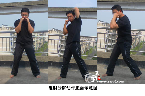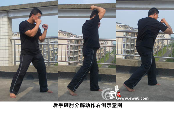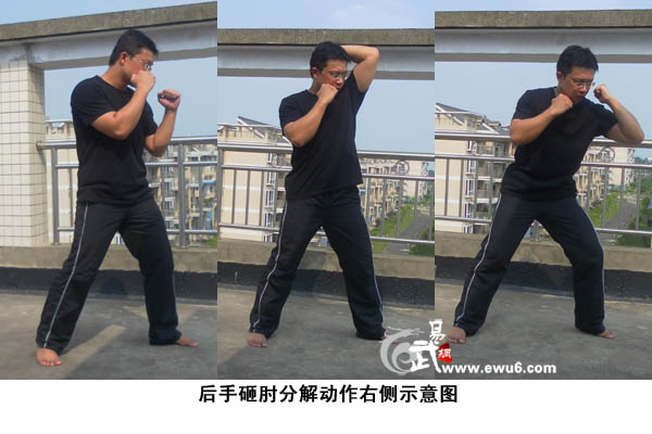 砸肘是由上向下攻击的肘法,主要用于对付低头冲入的对手,也可以主动腾空下砸对手头部,但那仅限于竞技格斗,自卫中不可乱用。