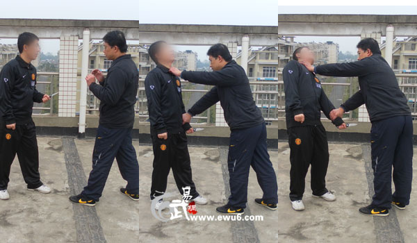 实际运用时最好能抓住对方持刀手的手腕或前臂,或者能抓住衣袖也行,并不是要你抓住后用擒拿夺刀,而是暂时控制住对方的持刀手,为另一只手的攻击创造条件,只要能抓住控制一秒钟就够用了,不要把时间浪费地和对方持刀手较劲撕扯上,一抓即打。 平时可以多和同伴用假刀进行练习,主要是训练抓拿持刀手的速度和准确性,一般对方持刀威胁时手不会静止不同,而是有小幅度的动作,所以准确性非常重要。抓拿成功时对方注意力自然会集中到持刀手上面来,另一只手的攻击成功率也很高。 总之如果平时的训练能达到你的同伴明知道你要抓拿压制他的持刀手,但就是逃不过你那一抓的动作,那在实战中的成功率就非常之高了。