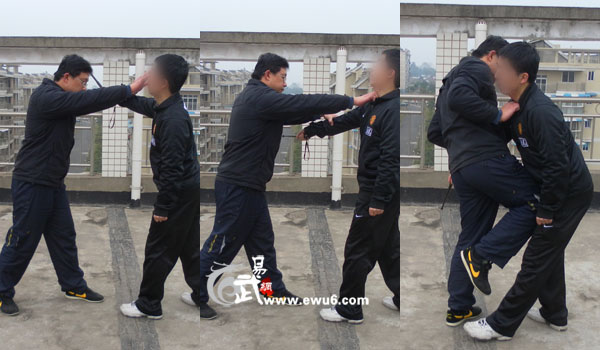 戳眼动作要轻快,以速度为准,即使没戳中也可以迫使对方仰头暴露咽喉,最后的抓衣领顶膝要充分借助回拉的力量,如果对手向后挣则借对方向后的力量前扑顶膝。