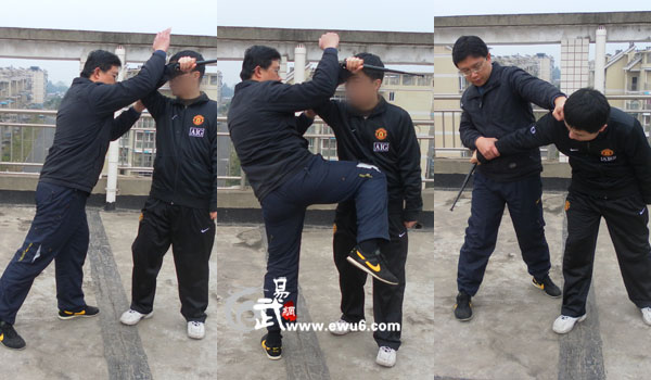 对手持棍向我头部劈打,我迎着下劈方向近身,同侧手由内向外格挡并顺势向下翻腕抓拿对方手臂,同时后手直戳对方双眼,如对方仰头再以平拳攻击对方喉结,然后抓住对方衣领爆发力回拉,并以顶膝攻击对方裆部。