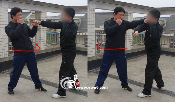 对手前手摆拳向我头部攻击,我后仰躲闪,并要以后手拳反击。在后仰同时身体稍向右反转,后手可适当回拉蓄力,对手拳从我面前打过后后腿蹬地发力,身体快速向左拧转,带动后手以直拳攻击对手面部。