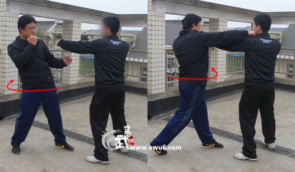 躲闪防守在实战中除了精确地避开对手的攻击外,还应该在躲闪同时配合身体扭转为反击动作蓄力,使反击动作更重。我们都知道,主动进攻时很忌讳提前身体反转,攻击手臂回拉等蓄力动作,如果有这些动作,就等于给对手报信,让对手提前作好防范。而躲闪反击时则可以在躲闪的同时完成这些动作,使自己的反击更加有力。在各种格斗项目的一锤定音式的击倒中,反击占有相当大的比例,也就是这个原因。下面配合几个战例详细讲解一下后仰过程中如果为自己的反击蓄力。因为照相角度问题,有些细节反映得不是很清楚,注意图中红线所标的用力方向路线。