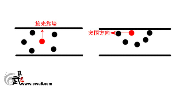 如果对手两边距离拉得比较开,而且明显一面人少,你又有趁手的武器,那你可以抢先向人少的一边发起冲击,力争在对手合围前冲破包围圈。但记住不要和前面挡你的人缠斗,可以配合有气势的攻击和突然转折的冲击路线强行突围。