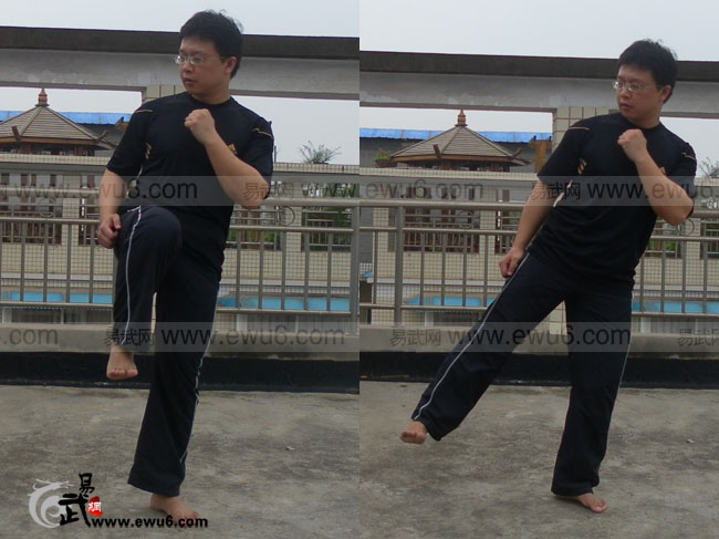 第一步:以右腿为例,自然站立,右腿自然提膝到大腿与地面平行,然后往下踩,踩的路线可以稍微向外一点,避免脚直接踩到地上。下踩时候脚尖勾起,力达脚跟。这一步重点体会正确的提膝和发力路线。下踩时腿部应该有明显的向外拉扯的感觉。