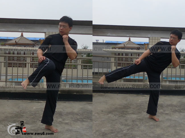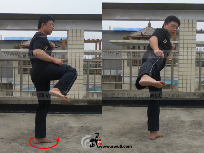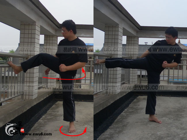 这个动作除了还没有用腰胯力量之外,单从腿部动作来说就已经是低侧踹了。注意从第一步过渡时不要着急,在保证发力时腿部始终有向外拉扯感觉的前提下一点点向外调整发力角度,直到能够斜45度左右向外侧发力。做到这一步后,再配合支撑腿的转动,提膝时支撑腿不动,向外踹出时支撑腿以前脚掌为轴旋转,脚跟转向腿踹出的方向。