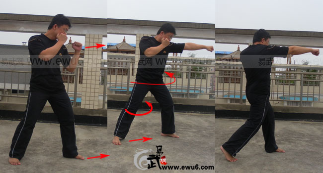 3,前脚落地后,胯部主动向左拧转,带动身体向左拧转,后手拳向前击出,后脚在身体左转的带动下向内拧转同时前跟一步。