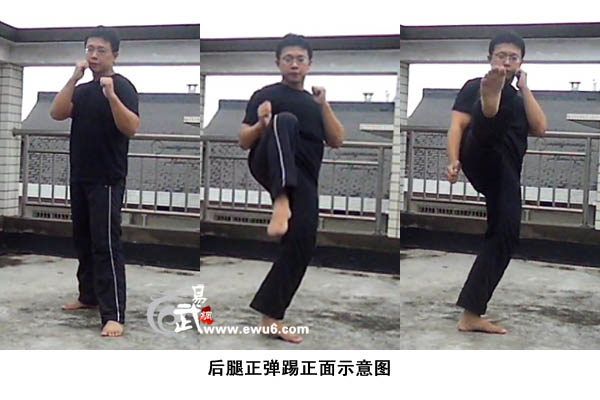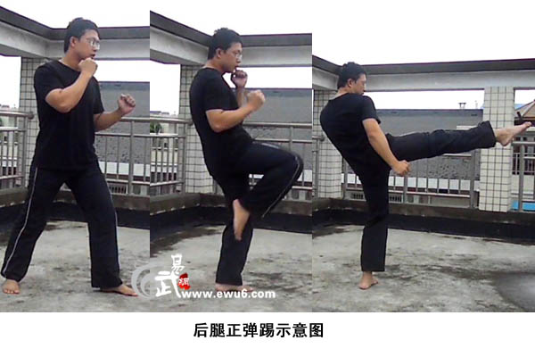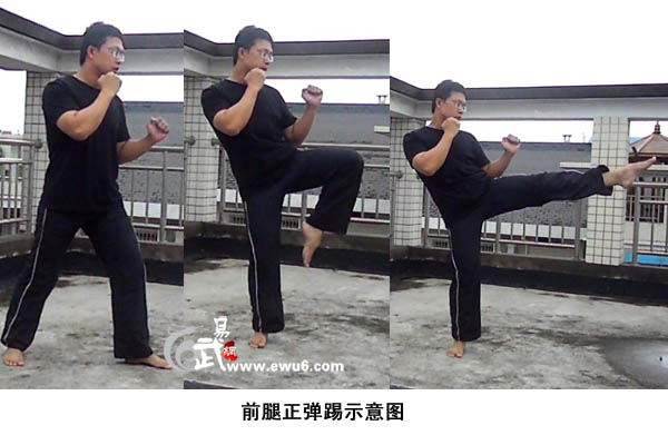 正弹踢是腿法中最基本也是最简单的,但也是腿法的基础,初学者建议多在这上面下点功夫,当你把正弹踢踢得轻松自如后,你练习其他腿法也会容易得多。