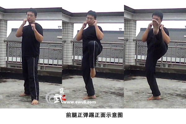 格斗式开始,上身稍后仰或者后脚向前脚并步,重心放到后脚上,胯向前顶,支撑腿向前旋转,前腿向前正提膝到大腿与地面平行,膝盖放松小腿自然下垂,然后小腿顺大腿向前提膝的力量用力弹直,脚背绷直,力达脚背。完成后攻击腿向前收腿落地恢复格斗式。