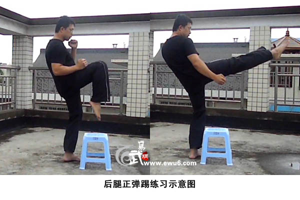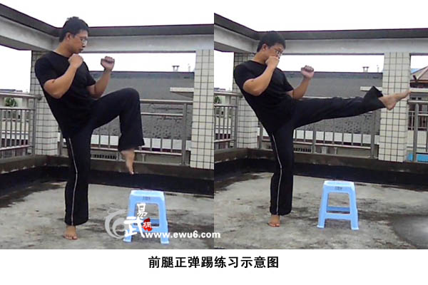 格斗式站好,在前脚前方10厘米处摆一个比膝盖矮10厘米左右的凳子,然后向前作正弹踢练习,如果提膝和大小腿折叠动作不到位,脚就会被凳子挡住,这个方法可以最快地使正弹踢动作定型。