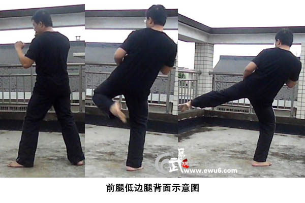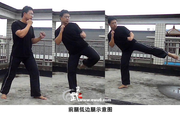 前边腿主要的力量来源是腰胯的向内旋转带动和小腿的弹腿,下面以前低边腿为例详细进行讲解。