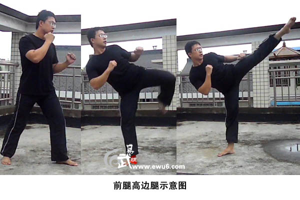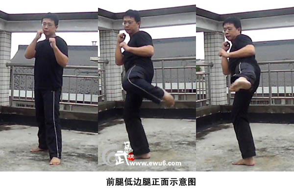 前腿中边腿与高边腿发力要领与低边腿一样,不同点在于想踢得更高,前腿提膝就要更高,踢准的秘诀就是:提膝扣胯时以大腿的延伸线瞄准目标。