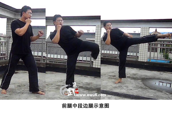 前边腿的步法: 前边腿攻击调整距离的步法一般有两种: 一是在支撑腿旋转时利用旋转的力量以前脚掌着地向前滑动,在散打中被称为“带步”或者“跟步”,这种步法非常隐蔽,在踢击同时就缩短了与对手的距离。 二是并步,后脚快速向前脚并拢,然后前脚向前踢击。这种步法相对较慢,但如果后脚向前脚斜向并步再踢,可以大大增加前边腿的力量。泰拳手的前腿扫踢常常采用这种步法。 对手与我前腿同侧面膝盖以上都是前边腿的攻击目标,尤其是对手以腿法攻击我下盘时以前高边腿迎击头部有很好的效果。但在自卫格斗中建议多踢击对手前腿内侧大腿根位置,有很高有踢中裆部的概率。