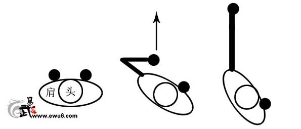 以上身转动力量推动作左手倒肘向前平抬,大小臂自然折叠,拳眼向上;