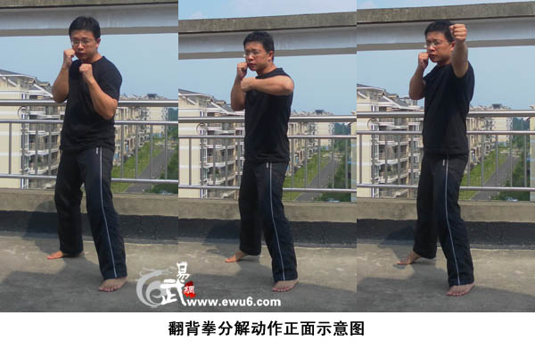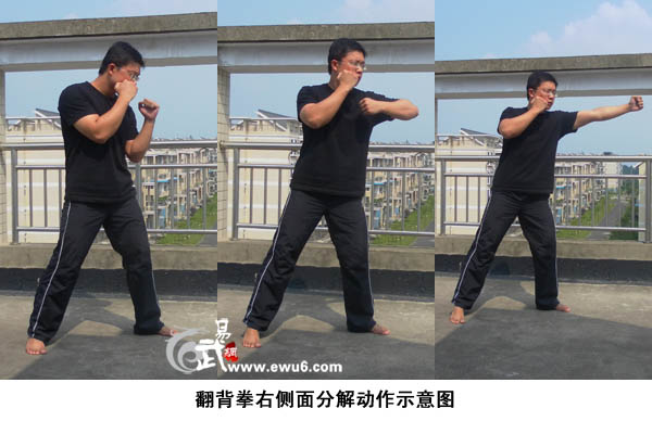翻背拳一般只用于前手攻击,从格斗式开始,腰胯以短脆劲向右拧转,上身略前倾,重心前移,左肩向前探出,手臂顺势折叠并以鞭击力抽出(如图)。