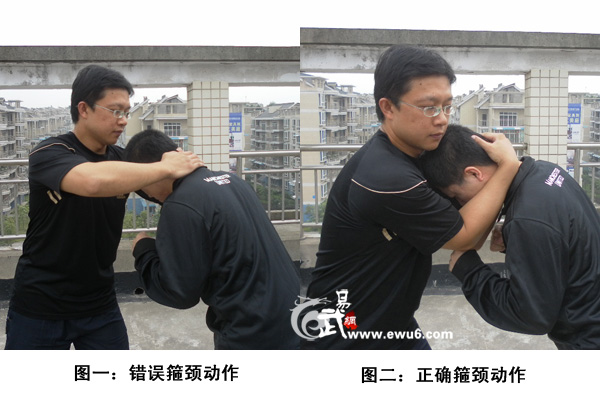 箍颈技术前面讲过,应该是象图二那样,两手交叉扣住对手后脑,前臂夹住对手颈部,两肘下坠,用整个身体的下坠力量按下对手头部,这样才能彻底地控制对手。如果象图一那样,对手只要两手向上一推,一低头就能摆脱。在自卫格斗中也可以采用抓对手衣服、头发或者耳朵的方式控制对手。